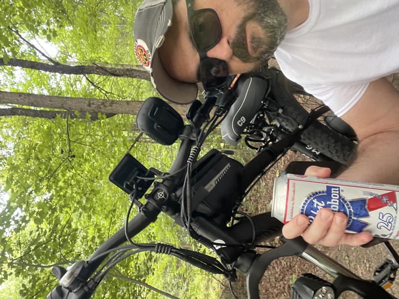 I saw a flock of wild turkeys in the woods. I called them but they were shy or just not interested. PBR big can, jamming to radar love, e-bike, turkeys. That’s how I live.